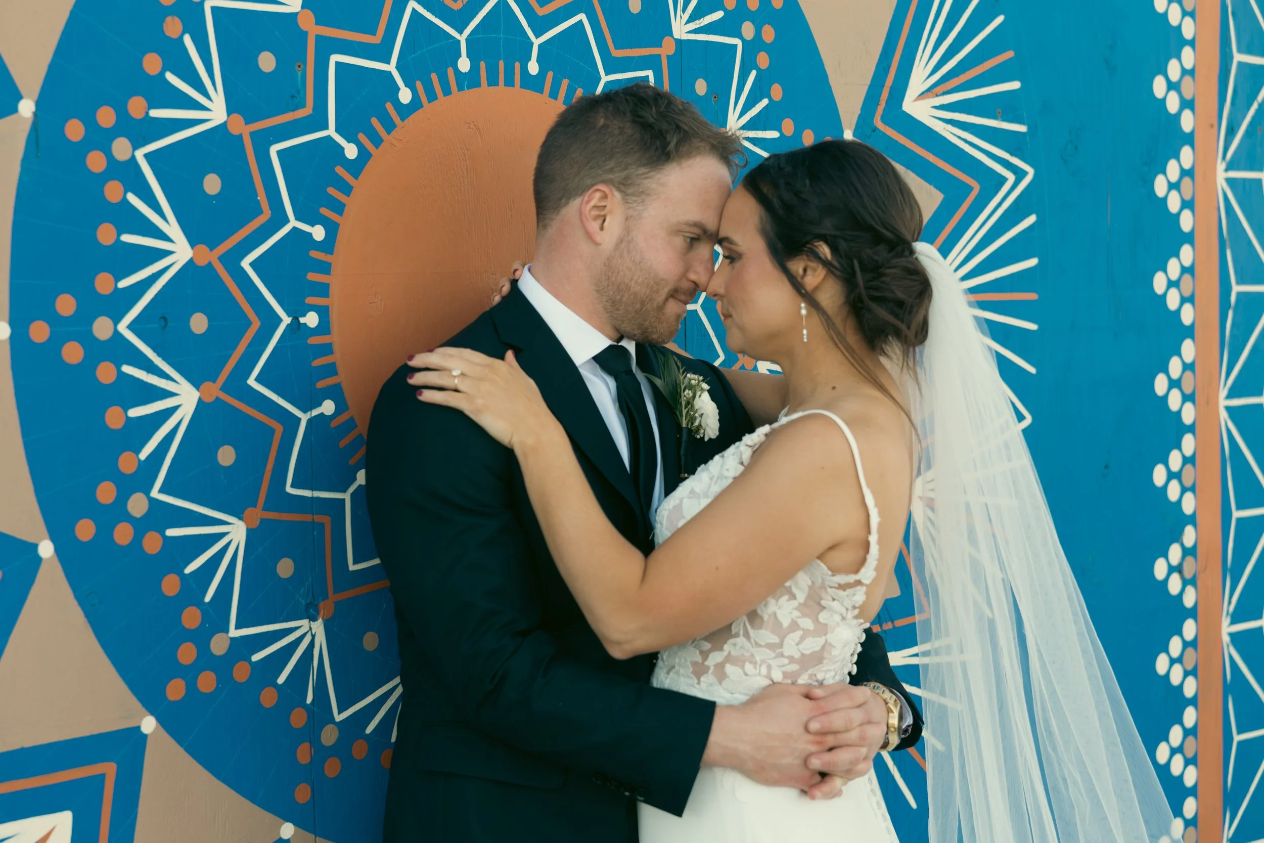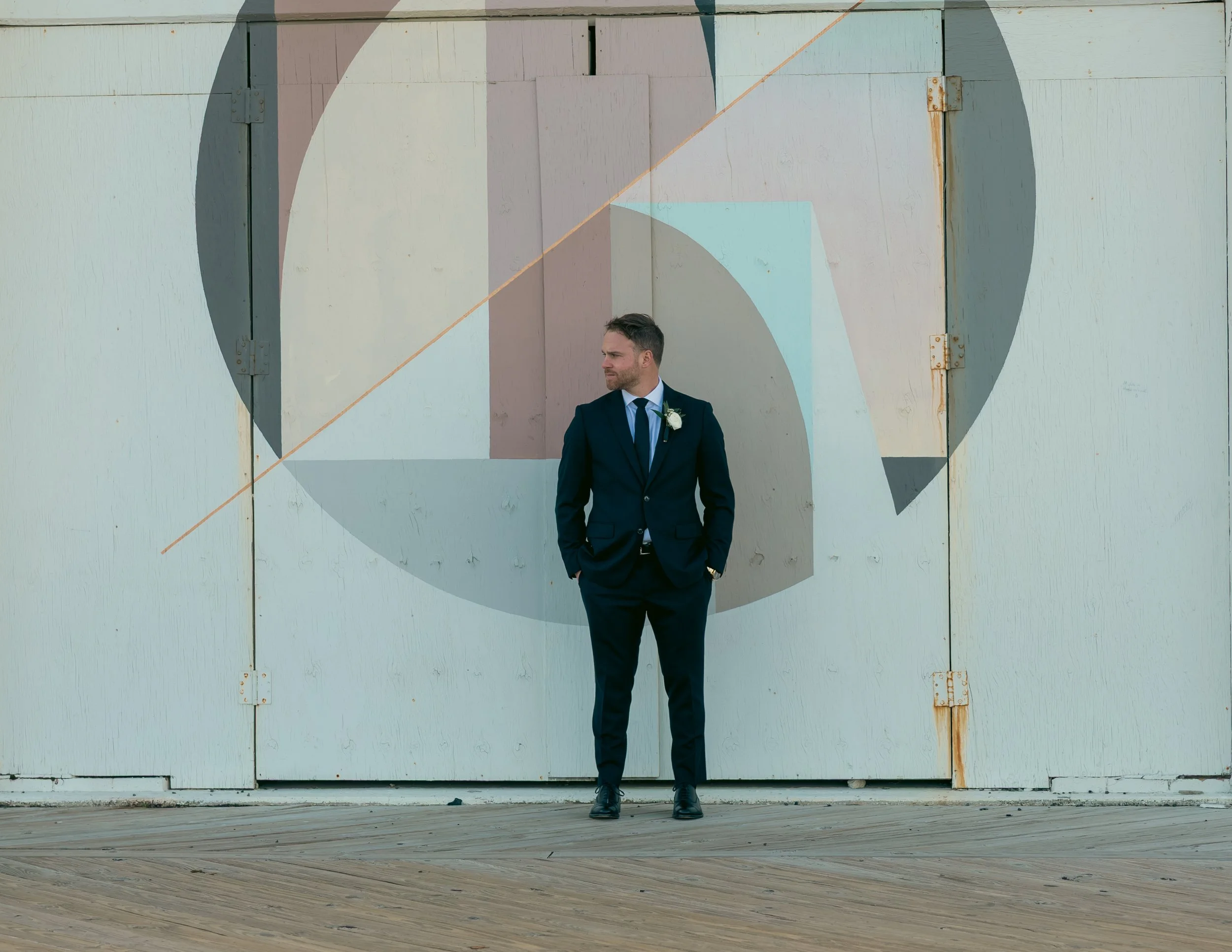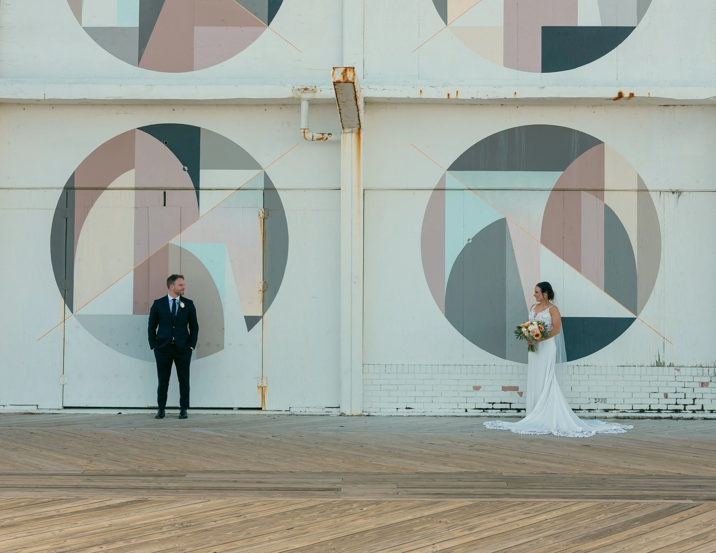 What struck me about Asbury Park was how its geometry and murals framed these emotions—not as decoration, but as quiet witnesses. Bold circles, faded lines, sun-bleached colors. The couple stood in front of them as if the city itself had offered a backdrop. There was something grounding about the contrast: two people beginning something new in a place shaped by so many stories before them.