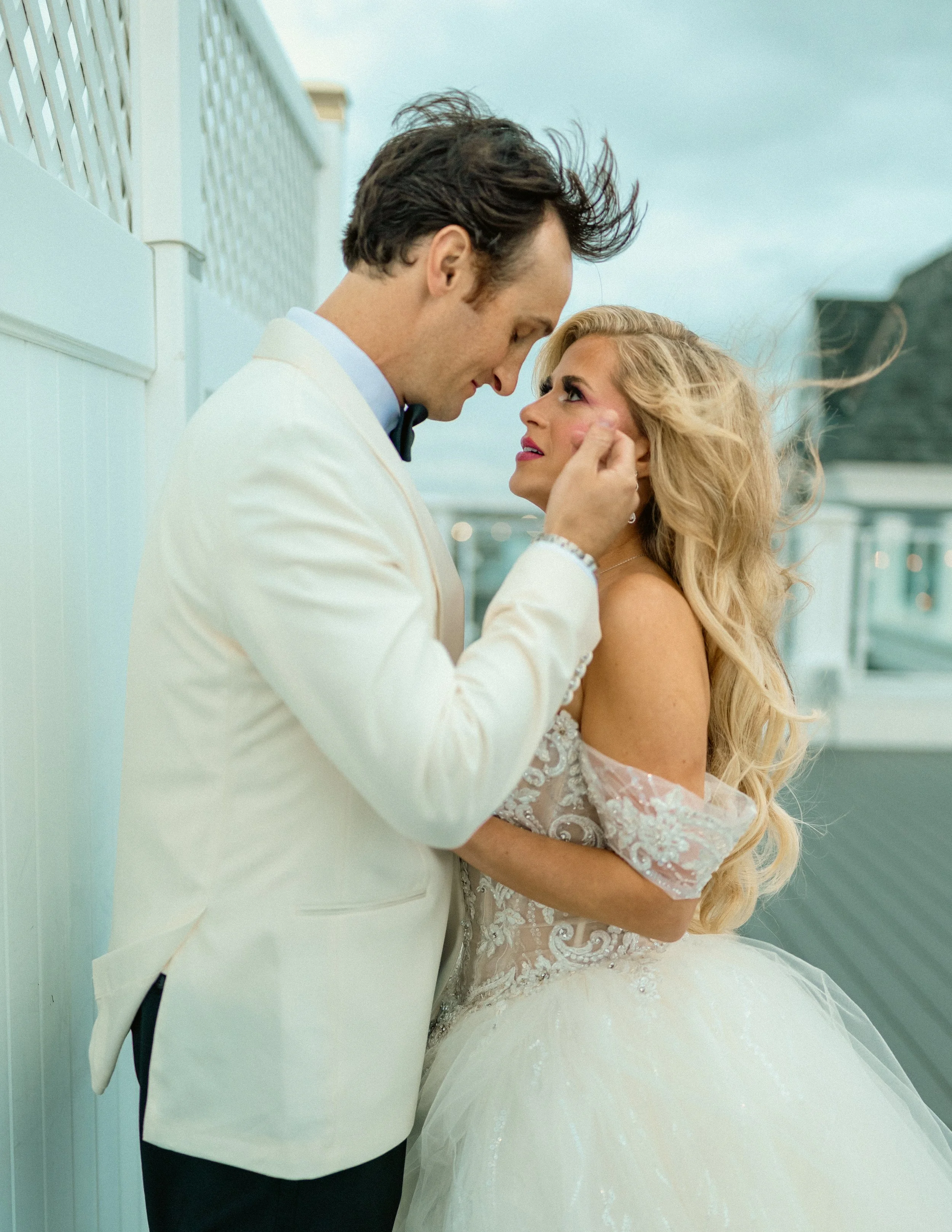 Later, as the wind picked up on the rooftop terrace, he pulled her close again. Her hair moved wildly, his jacket swayed, and the sky behind them turned a soft Long Island blue. They kissed like they were the only two people on the coast.